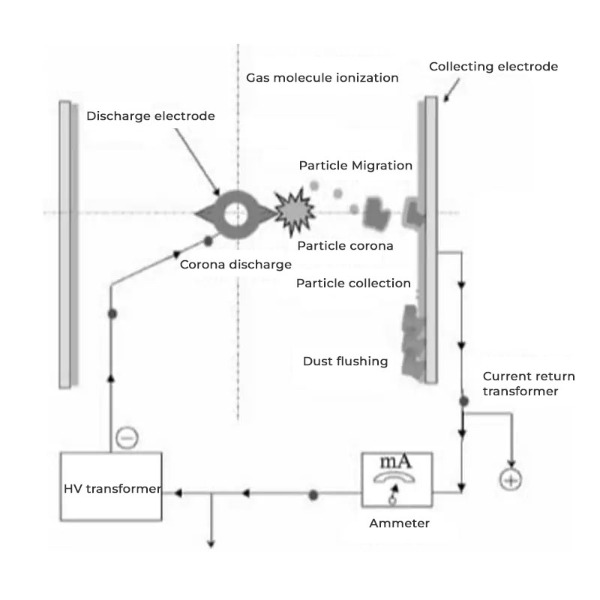 Precipitator elektrostatik (ESP) ialah peranti yang sangat cekap digunakan untuk mengeluarkan bahan zarah terampai daripada gas ekzos industri. ESP berfungsi berdasarkan prinsip tarikan elektrostatik, di mana zarah bawaan udara dicas dan kemudian dikumpulkan pada permukaan yang dibumikan, mengeluarkannya dari udara. Peranti ini biasanya terdiri daripada dua komponen utama: elektrod nyahcas dan elektrod pengumpul. Apabila arus terus (DC) voltan tinggi digunakan pada elektrod nyahcas, medan elektrik yang kuat terhasil. Medan ini mengionkan zarah di udara, menyebabkan mereka memperoleh cas negatif. Zarah yang bercas negatif kemudiannya tertarik kepada pengumpul yang dibumikan secara positif, di mana ia terkumpul dan akhirnya dikeluarkan melalui gabungan kaedah getaran dan mekanikal.